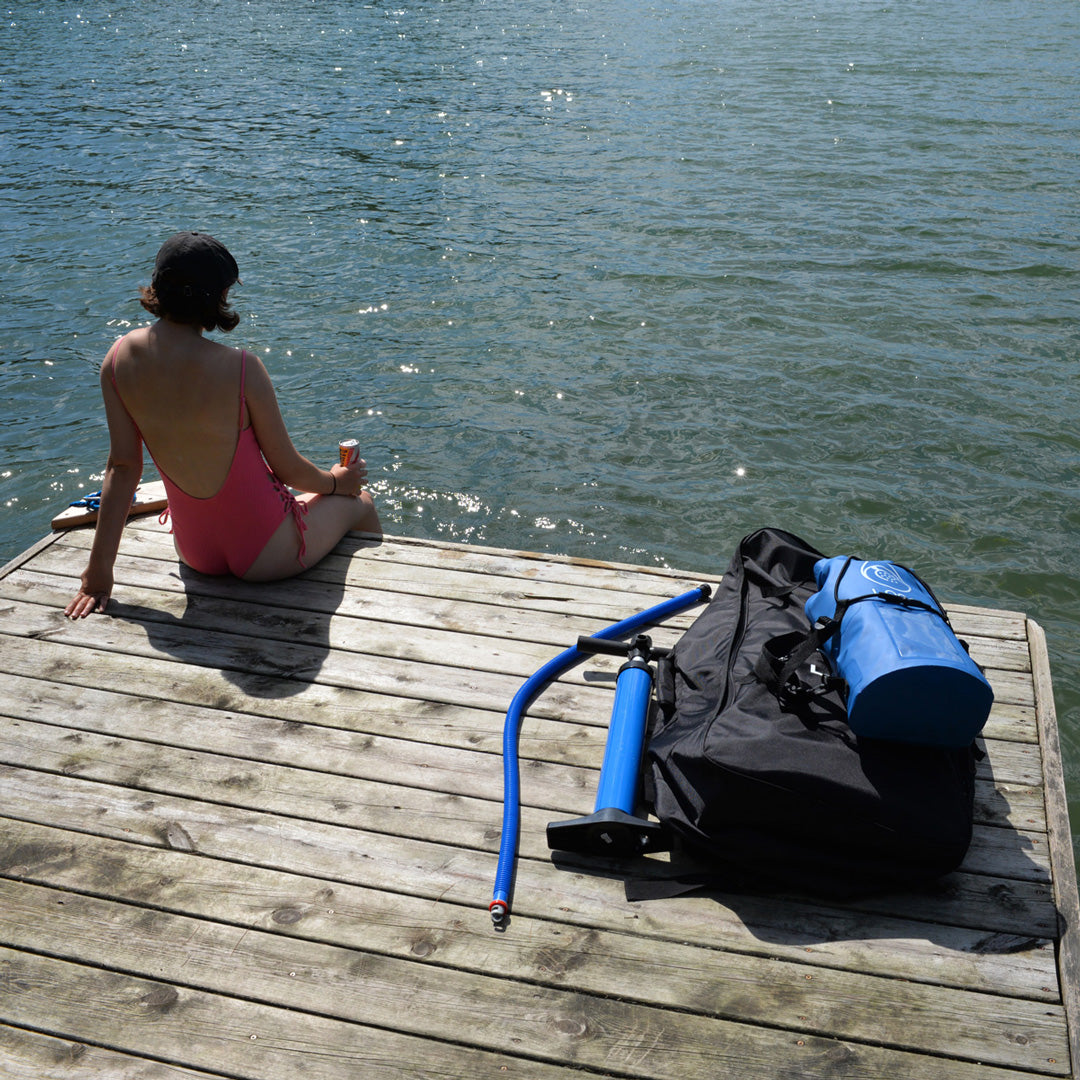 A double-action, high-pressure pump to get you on the water in a flash. When you're gone for the day and you've let the air out, simply reverse the pump and suck the last bits of air from your board. No awkward attempts at rolling up your board while there's still air in it.